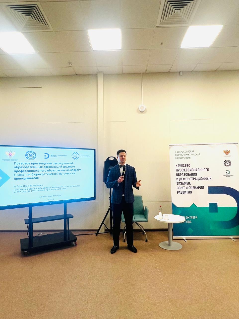 С докладом «Правовое просвещение руководителей образовательных организаций среднего профессионального образования по вопросу снижения бюрократической нагрузки на преподавателя» выступил Рубцов Иван Валерьевич, начальник отдела профилактики нарушений законодательства министерства.